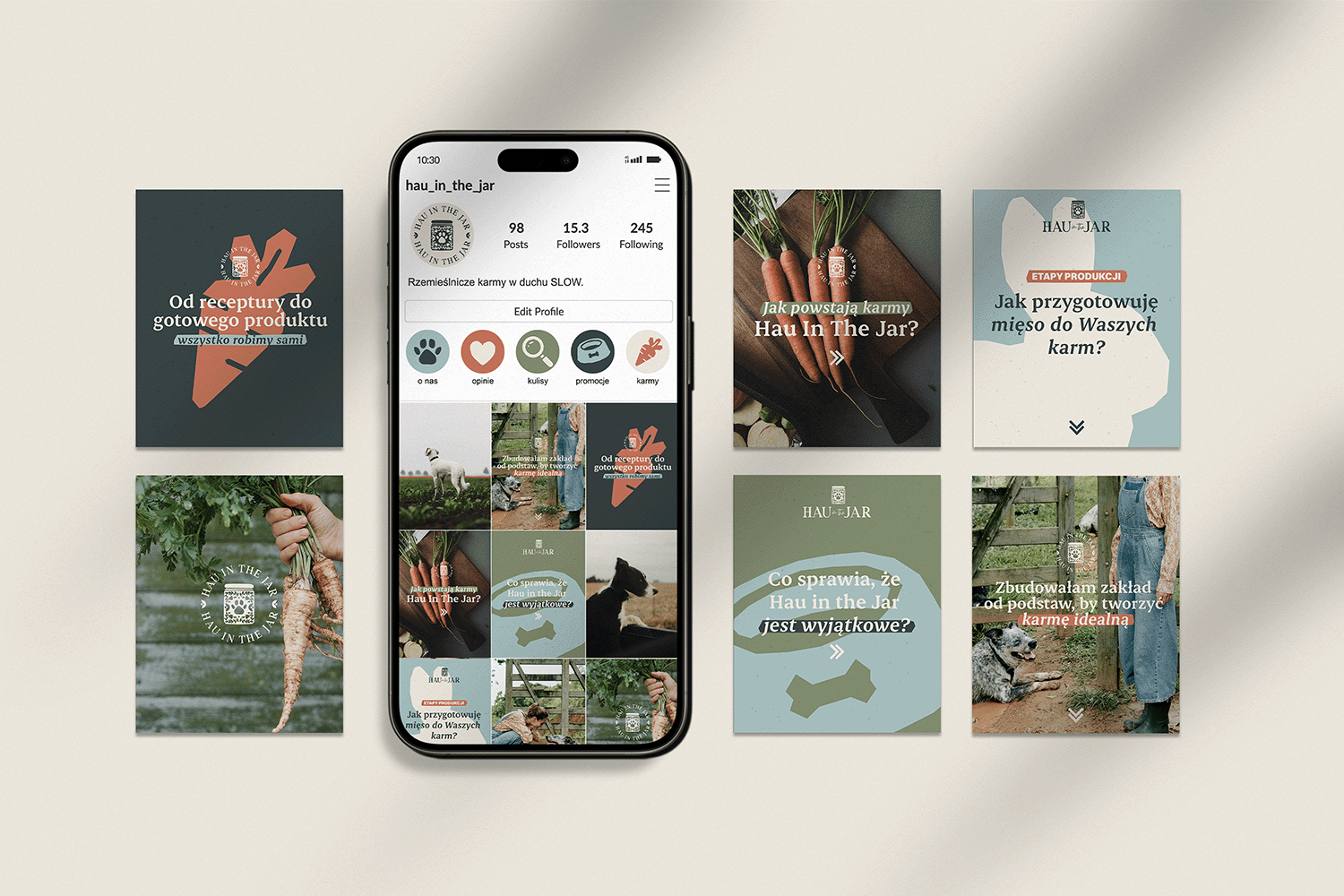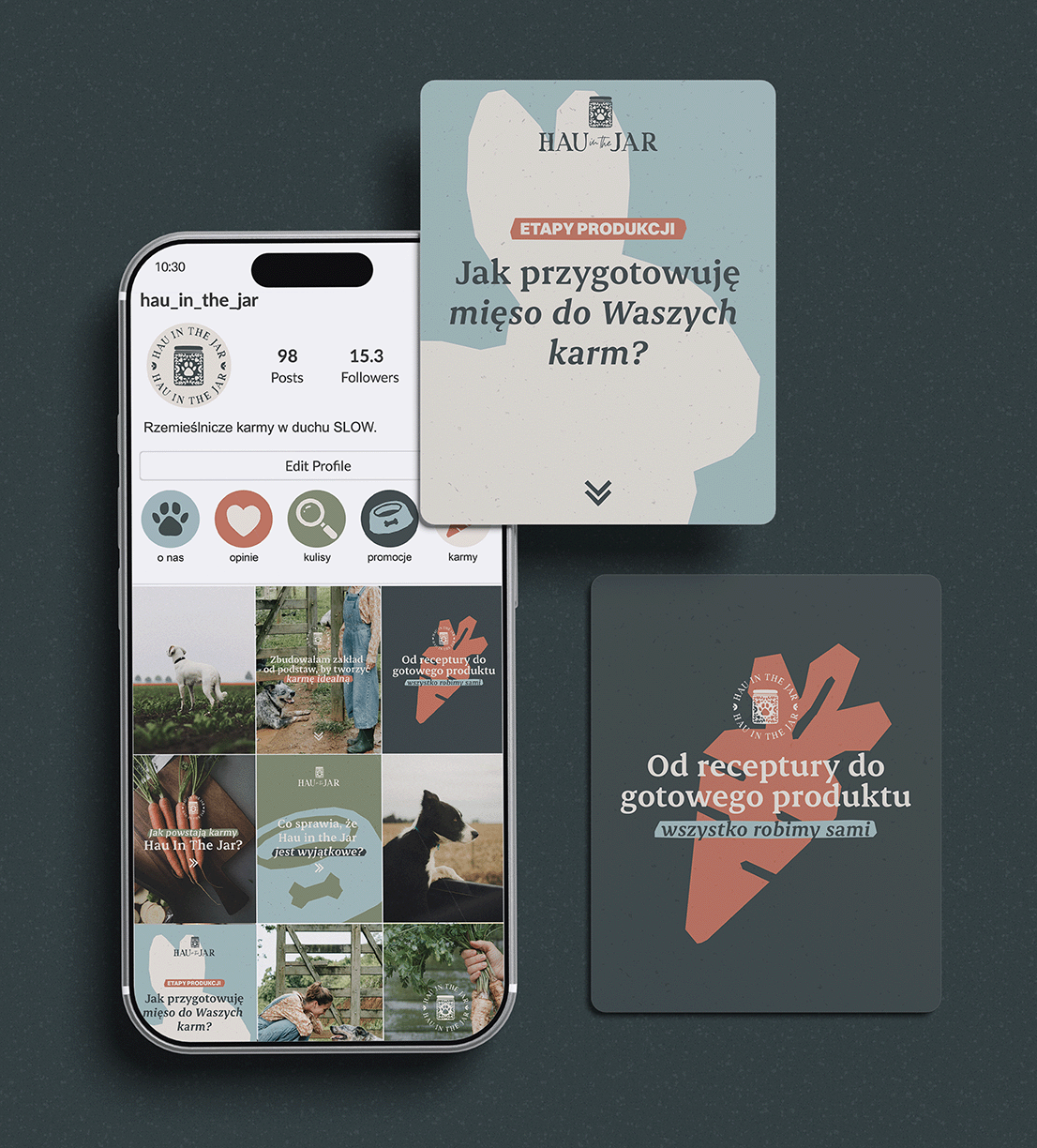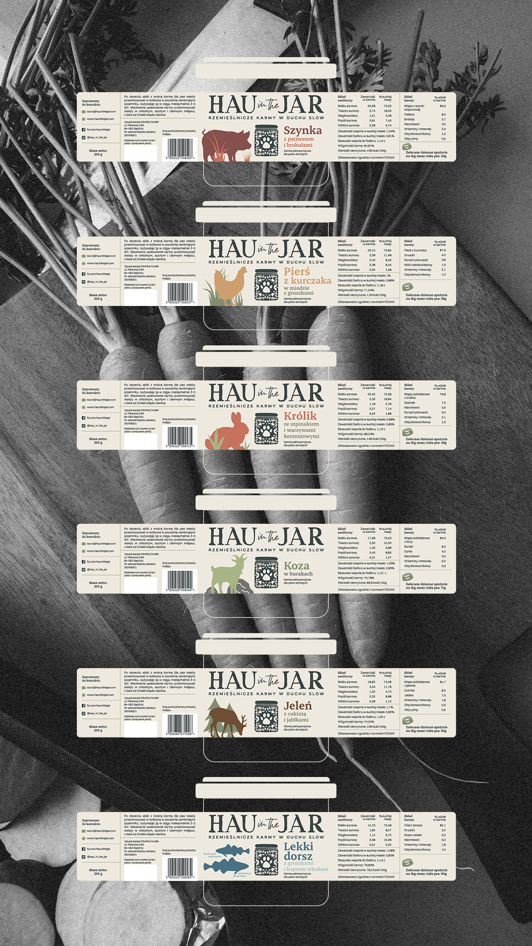 Hau in the Jar to rzemieślnicza manufaktura karm dla psów, oparta na jakości, naukowym podejściu i świadomym procesie tworzenia. Od początku kluczowe było, aby wizerunek marki oddawał jej autentyczność, bliskość i ręczny charakter produkcji.